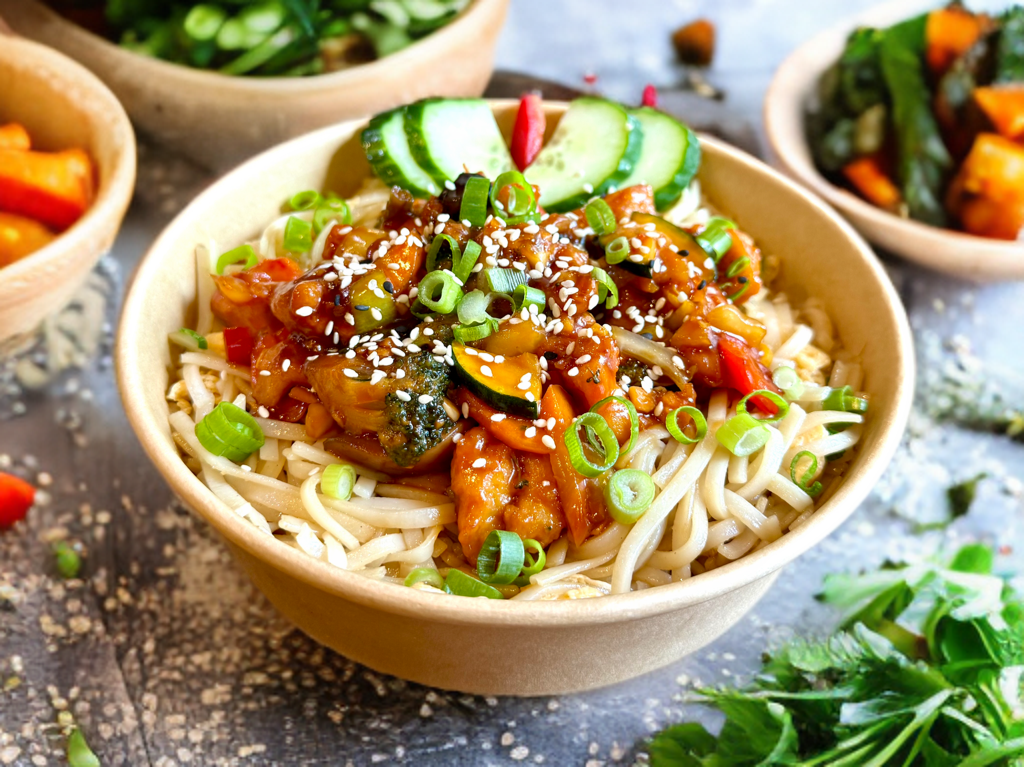 654. Riisinuudlid värskete köögiviljadega ja kanateriyaki kastmes.
