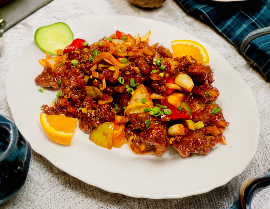 Krõbedaks praetud part sibula ja paprikaga.
